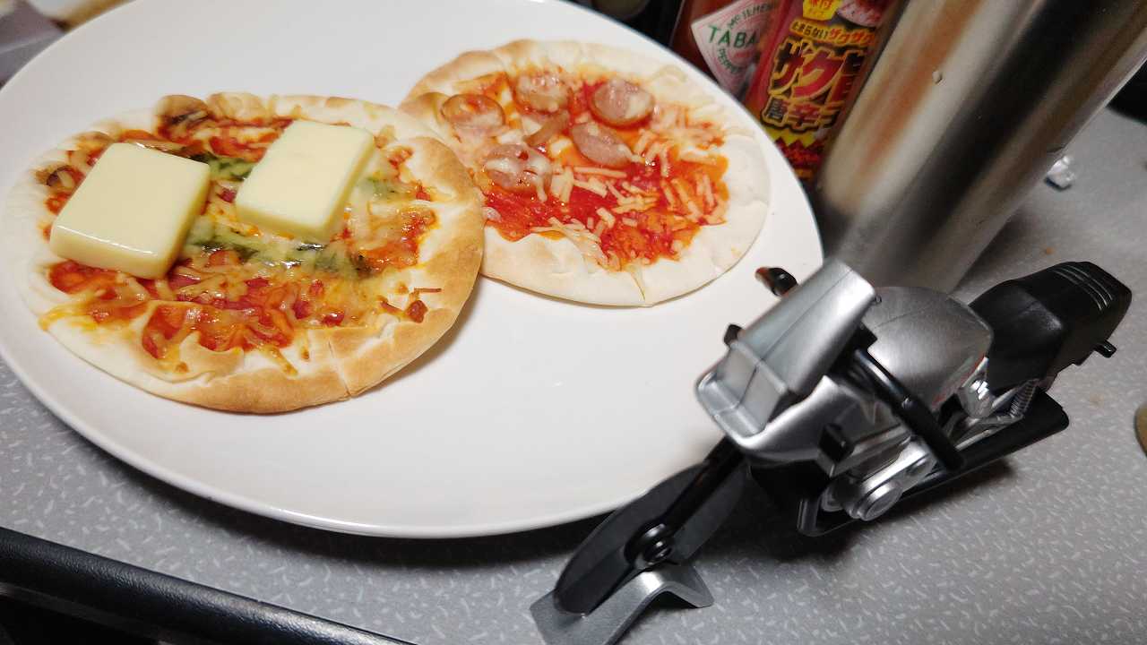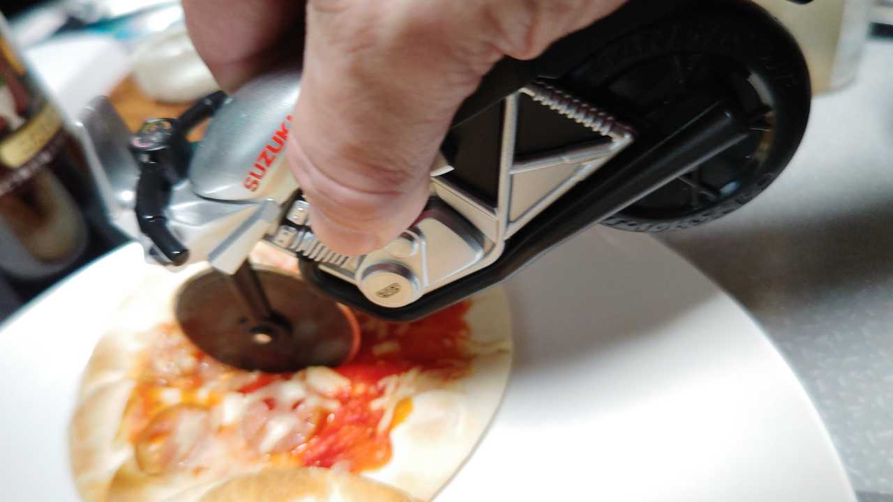 ミニピザ、切れ目が入ってるが、無視して、カッターナさんをつかう。。。