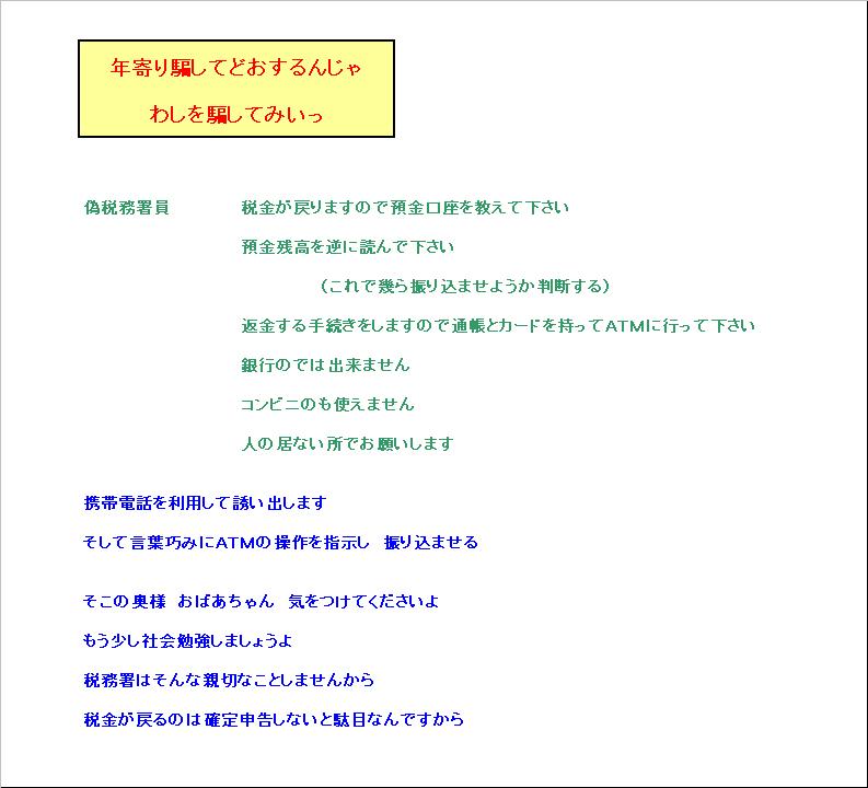 どおして弱いんですかねぇ甘い話にもお少し考える事をしましょうょ自分に都合の良い判断ばかりしていると引っかかりますよ疑う事も必要です世の中 甘い話なんて有りません税務署員への成りすまし詐欺にご注意を税法も法律です法律は主張する権利のみを保護するこれが基本です自ら主張しないものは時効等により抹消されますよ