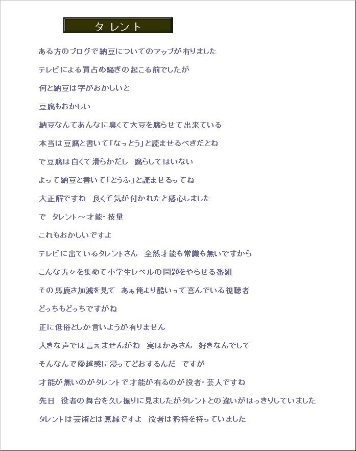 カタカナ語は嫌いなんですが今日はタレントです本当の意味はご存知の通り「才能」ですねでも日本では才能の有る人をタレントとは呼びません変な言葉です他にも変な言葉って有りますね