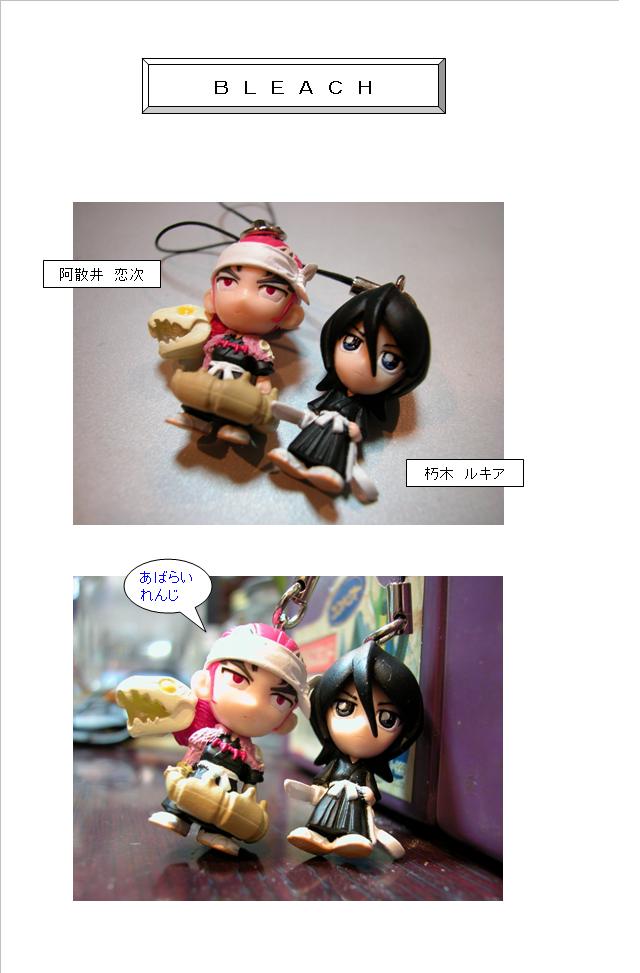 今風に言いますとストラップなんでしょうか私は財布には付けませんが携帯電話にも付けられません持っていませんので・・・ でも買ってしまいました携帯じゃあ有りませんよ ストラップですでも付けられないじゃないかってご心配無用ですよぺん立てのぺんに付けてますPCしながら眺めてます・・・・洗剤では無いブリーチ 朽木ルキア(かわいい)阿散井 恋次(あばらい れんじ かっこいいっ)