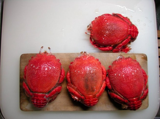 昨日はの夕食変わった物でした以前勤務していた会社の伊○君に言わせると地球を侵略する目的でやってきたんだと公言して憚りませんだいたい形からしてエイリアンだと言ってます又 彼は「蟹ゲップ事件」なるものを・・・これ以上は危険なので書けません以前テレビで旭蟹っていう蟹が九州で取れると言ってました大変珍しい蟹で 味は繊細だそうですネット・オークションで比較的安価で落札出来たものが昨日届き早速 茹でて頂きました蟹味噌はオレンジ色かみさん 旨いって言ってました(私は蟹味噌食べられないんです) 身は・・・・めちゃめちゃ旨いっ