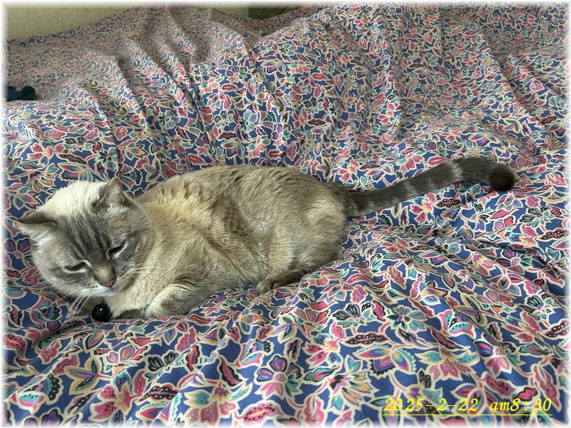 4月で17才になる茶々丸ですが今は傍にいてくれるだけで、私たち家族は幸せに思いますそんな茶々丸が手助けしてくれる事があるのです秋までは朝早くに起きて畑へ出かけていた夫ですが今は遅くまで寝ているので茶々丸に「茶々、パパは?パパを起こしてちょうだい」と(最低3回以上)繰り返すと夫の枕元へ行って鳴いてくれるのです大抵はここで夫は起きるのですが、それが失敗だと次は重い重い作戦に変わります最近痩せては来たのですが、それでも4kgちょっとあり上に乗られたら夫もギブアップで起きざる得ないのですもっとも夫が起きれば階下へ行ってウエットフードをもらえるので次は下へ行こう下へ行こうと夫に催促するのですけどね