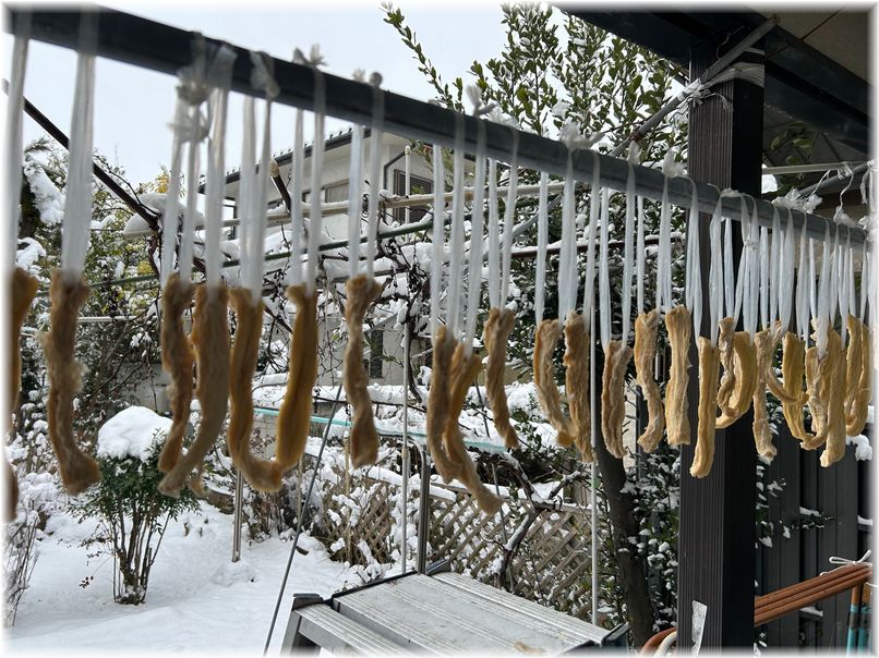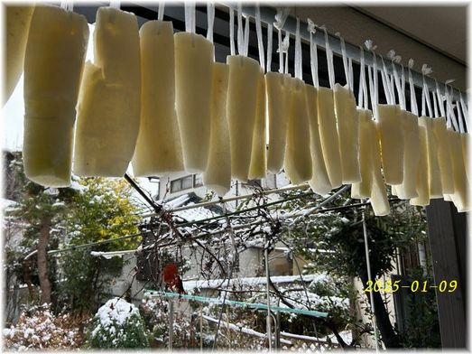 今日も雪降りで外歩きは無理ですが凍み大根の方は上手く出来て来たようです昨日のヒヨドリですが、家の中に入れて良かったです今朝、家の周りの雪の上に2匹かな?猫の足跡があったので、入れなかったらどうなっていたかと..午前中に預かってくださいと云った方がお礼にとお菓子を持ってヒヨドリを引き取りにいらしたのです暫くは段ボールに入れて様子を見、元気になったら外に放してあげたいとおっしゃっていました今朝見たら昨夜あげたリンゴもパンも無くなっていて新しいパンをちぎって入れるとすぐに食べたのできっとお腹が減っていたのでしょう実はヒヨドリを渡すために蓋を外したら飛べはしないのですが逃げられて部屋の中を追いかける位元気になっていたので放されても自分の力で生きて行って欲しいとそう願いながらヒヨドリを渡しました 今こうして書きながら外を見ましたら、再び雪が強く降り出して来たみたいです