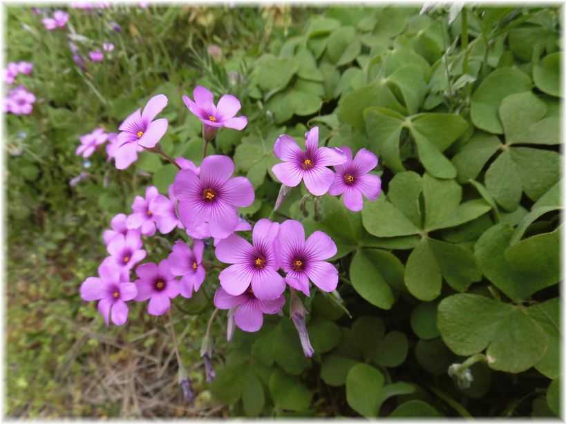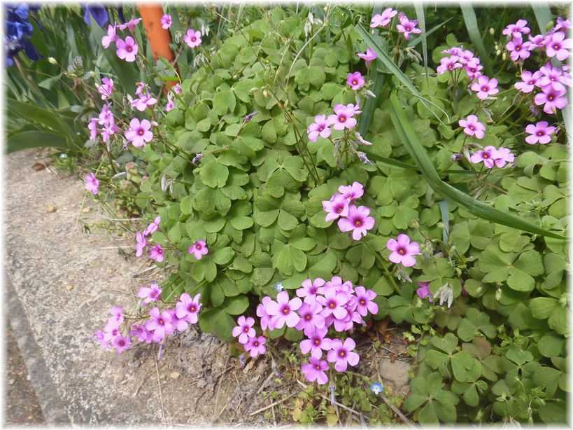 アヤメの先にはこんどはピンク色のオキザリスが咲いていたのです