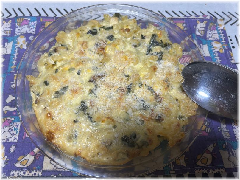 マカロニ、もどした干し椎茸に緑色はホウレンソウであります ꒰*´∀`*꒱