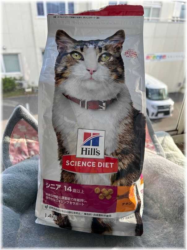 茶々丸も17才と6ヶ月になりましたが食べているカリカリは14才以上のをあげていますしかし、先週金曜日の脱走以降カリカリを食べずそれまで食べていた缶詰も食べなくなり心配でカワチ薬品まで食べられそうなのを探しに行って高齢猫用のジュレ状のウェットフードを買ってみたのですカリカリと混ぜるのですが、カリカリを少し砕いて混ぜて見ましたら少しずつ食べるようになったのです徐々に食欲も出て来た様子で、今日などは叩いて砕こうとテーブルの上にカリカリを置いておいたら砕いていないカリカリを食べていたのでした久し振りのお外の散歩は茶々にとってしんどく疲れたのかも知れませんちょうど1週間で食欲も戻って元気になってくれて一安心ですでも、カリカリはやっぱり砕いてあげようと思いますᶻᶻᶻ(ᯫ᳐⭐︎˗ ˔ กᯫ᳐)*