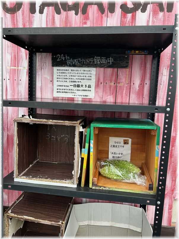 今朝、台所の窓に目をやると大きくなったゴーヤが3本見えたので外に出て切り取ったものの、冷凍庫にはすでに冷凍保存されたゴーヤが沢山あるので飯坂街道にあるセブンイレブン迄歩いて行き子ども食堂のお互いさまボックスの中にゴーヤをおいて来たのですまだ小さい実が二つ三つあったので、それも大きくなったら置いて来ようと思います、誰かは食べてくれるでしょうと願って