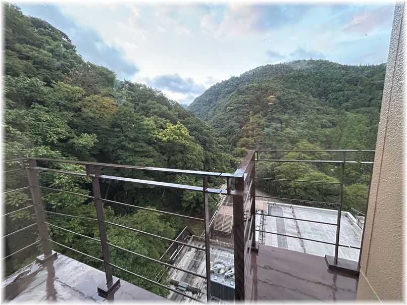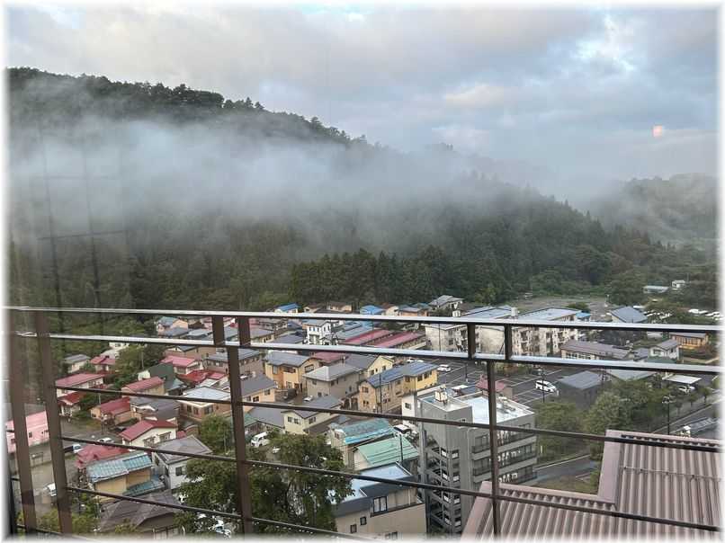 さて、お風呂の話になりますが着いてからと夕食後の2回温泉に入りまして翌朝4時に夫が起きて「千寿の湯へ行って来る」と云うので私も4時からが女性タイムになる天狗の湯へ行ったのです当然私以外は誰もいませんいつ掃除するのか、イスと桶は綺麗にセットされていまして乳濁白色で42,3度位でしょうか?湯質もとても気持ちの良い温泉ですこの天狗の湯は内湯から矢印の方向へドアを開けて外の露天風呂へと移動できます周囲には高い囲いがされているので熊の心配をせずにのんびり温泉に浸かってこれましたいつもはパン食の夫ですが、出された和食の朝ご飯を美味しいと云いながら綺麗に頂き更に最後にもう1度お風呂に行き、全部の温泉に入って来たと希望だった温泉に来れた事をとても喜んでいました(帰りのバスから)このホテルは、鬼面山(標高: 1482m)の中腹にあり今年の春に雪崩で孤立し全国放送でもニュースになった所です2台の車がやっとすれ違える様な山道を行くのですが近くには『小峠古戦場跡』と期された看板があり昔はこんな山奥でも戦いがあったのかと驚いてしまいます再び送迎バスで福島駅まで送ってもらいタクシーで家に帰ったのですが夫はそのまま「畑の顔を見て来る」と出掛けて行きました┐('~`;)┌