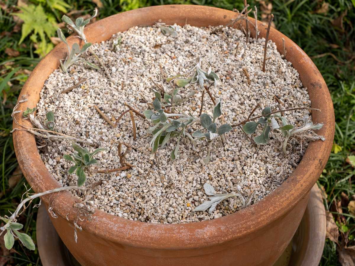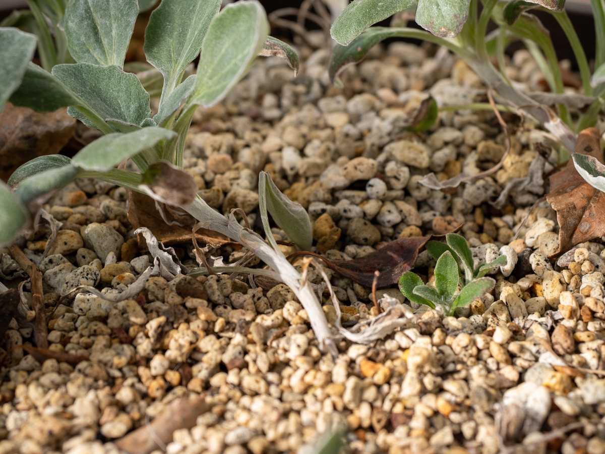 軽石の間から芽が飛び出てます。