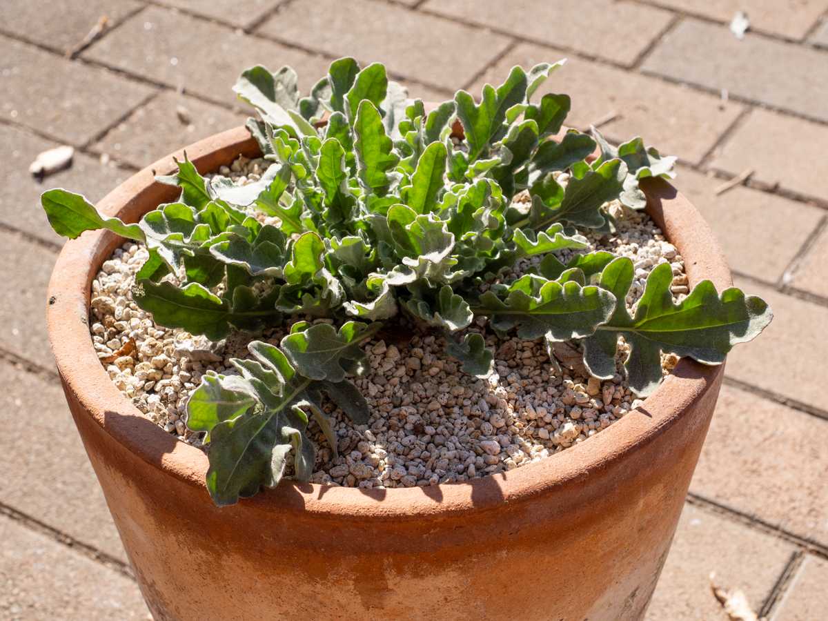 小さめの背の高いテラコッタ風の素焼き鉢に植えておいた挿し芽の苗は、ほとんど傷まずこのとおりです。