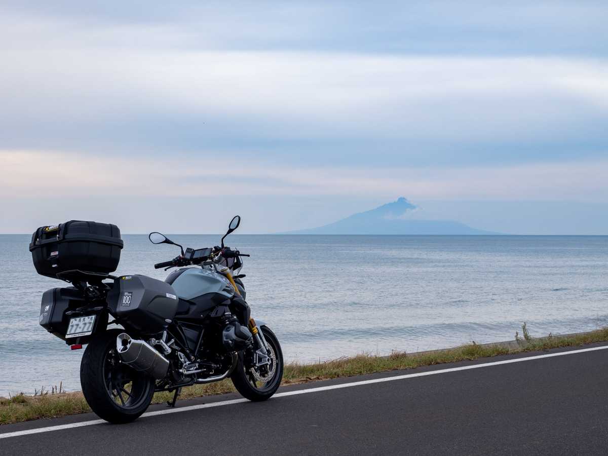 利尻島がだんだんと大きくなってくる。海とバイクと利尻島の写真を撮りたいと、今日の目的地直前で海沿いの道に反れる。利尻が見えると道北に来たという実感がわいてくる。相変わらずの曇り空である。この道路は記念撮影に良い場所である。