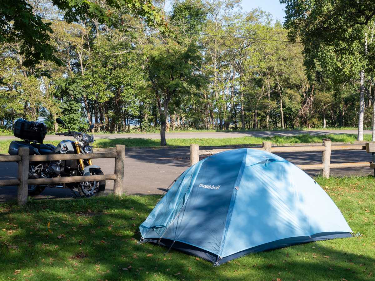 道路側の駐車場にバイクを移動し、そばにテントを設営。