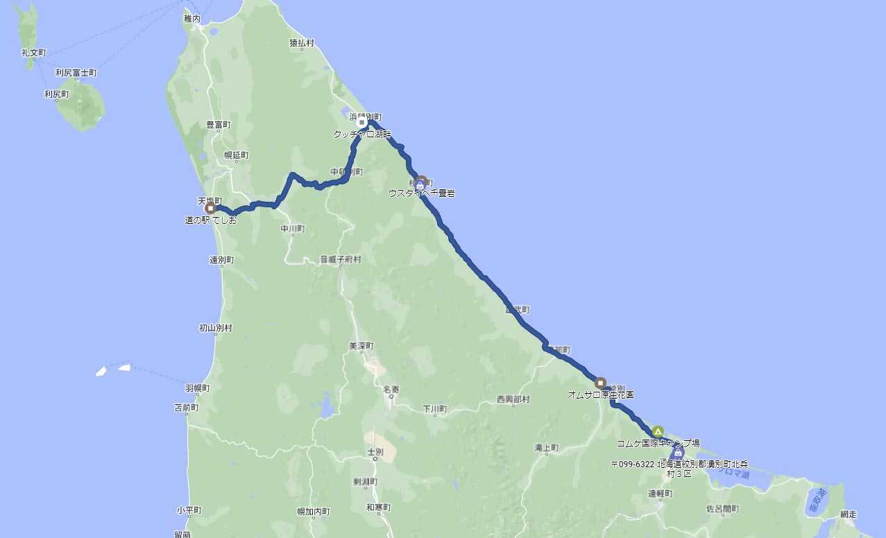 紋別の街を過ぎ、「コムケ国際キャンプ場」の案内板を見、中湧別の街を通り過ぎたのが15:00頃である。このまま美幌のキャンプ場に行くか、先ほどのコムケ国際キャンプ場に泊まるか迷いが出てきたが、結局コムケ国際キャンプ場に泊まることにした。後からグーグルマップを見れば中湧別にもキャンプ場があり、しっかり事前チェックもしていた。