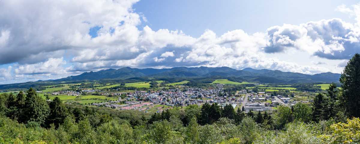 展望台の階段を上がると、中頓別の街と牧草地と山々がきれいに見えた。空には雲が多いが、街の上だけが青空であるように見える。