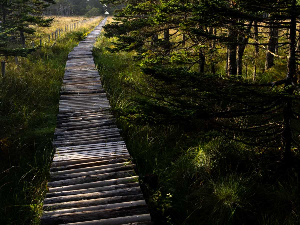 歩道が西方の赤白のポール(地球環境モニタリングステーション落石岬)