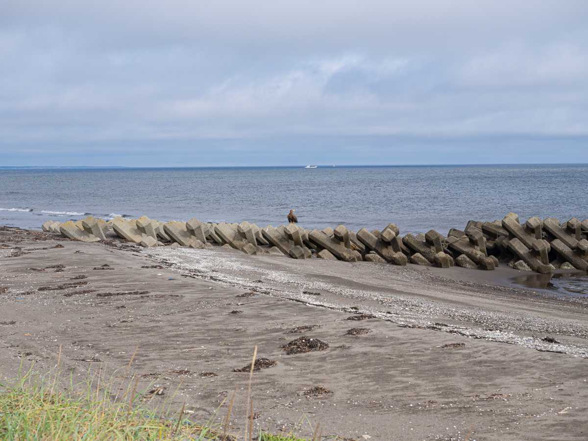 波消しブロックの上にいるのは、オジロワシではなかろうか。私は無知に違いが、関東では滅多に見ることのできない大型の猛禽類である。標準ズームの80mm換算でもこんなに大きく撮ることができる距離にいる。