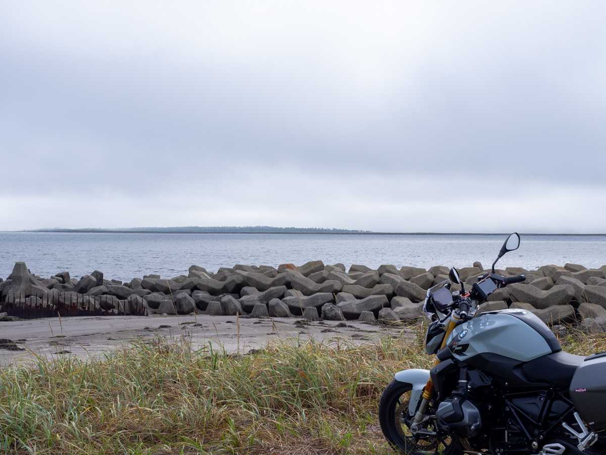 右手の砂の凸部にバイクで上がってみた。うまく上がることができたが、もうこんなことはしないようにしたい。この重さのバイクでタイヤが砂に埋まったら、一人ではどうすることもできないだろう。写真の左下が上の写真の行き止まりである。水面の奥に見えるのは春国岱の先端と思われる。