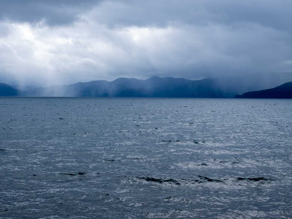 支笏湖に着いたのは13:00過ぎである。空模様は怪しい。相変わらずの昼食を湖畔のテーブル付きベンチで食べる。