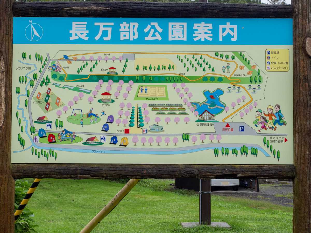 長万部公園の案内図。フラノベツ川の左岸にあり、キャンプサイトは川に近い部分である。上流にはバンガローもある。