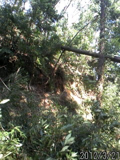 「北の虎口 2 横矢と武士だまり」 これが、虎口んとこの写真だど。 わがっかな? 真ん中に道が通ってんだけんど、右いって、左いってって感じで、曲がってっぺ。 まっすぐに進めないようにしてあんだな。 そんで、 最初の曲がり角んとこが、『虎口』って看板があったとこ。 ここも、よ~ぐみっと、おや?って思えるとこがある。 これは『虎口』の看板の横んとこ。 溝みたいになってたど。 ネットで調べて見たら、この溝の辺りに『武士だまり』っていわれる場所があったらしいど。 そういえば、丘の向こうに広場みたいな場所があったような・・・ 笹がみっちり茂ってたんで、わがんねかったな。 それから、正面の崖のうえには、『横矢』って広い場所があんだ。 これは上さ上がったときに、撮った写真なんだ。 実際に上がってみると、下の道がみえたよ。 横矢の高さは、2mぐらいあったかな? 残念なんは、ここにも笹が生い茂っててな。 横矢の先まで、行けなかったことかな。 足元がしっかりしてたら、ちゃんとした写真も撮れたんだけど。 安全第一だかんな。 ちらっと見ただけで、がまんだべ。 ここから、敵を狙い撃ちにしたんだべな~。 ちょっと離れた場所で、しばし、妄想・・・w。 ランキング参加中! ぽちっと 押しとこれ~!にほんブログ村にほんブログ村