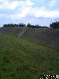 「櫓台5と、その先」 次は、『櫓台5』へ行ってみっぺかな。 土塁がづ~っと続いてて、上を歩いていけそうなんだけど。 立ち入り禁止になってた。 それに、入口にあたる場所は、土塁さとぎれてっからな。 どっちにしても、一端下へ降りなきゃなんない。 めんどいな~。 昔の兵士も、移動の際は、いちいち下に降りたんだべか。 それとも、通行用の橋でも、あったかな? なんて、な。くだらないことさ、考えながら、『六号堀』と土塁の内側に当たる、ひろびろとした道を、ぽてぽてと北へ向かう。 入口を通り越して、さらに進むと、 ここが『櫓台5』だどw。 城の内側からみっと、ただの土塁みたいだけんど。 よ~く、みとこれね。上にちっこい案内版さ、みえるっぺ? ってことは。上さあがっていいんだべな。 いざ、土塁さ登るべ! ってとこで、緊急事態発生! 登り口さ、ないど? よ~くみると、土塁の壁に申し訳程度の板がある。 階段っつうより、花壇の土止めみたい。 だども、他に上がっとこさ、ないから、そろっと足さかけてみた。 つま先がやっとかかるぐらい幅だど。 お、おっこち、そうなんだ、けど? やっとこさっとこ。上まできたど。 南に見えるのが、入口の橋と『櫓台4』。 城外に目を向けると、駐車場周辺が、丸見え。『櫓台5』から、さらに北に目を向けると、鬼怒川の流れが、すばらしい~べ~! この櫓台がこさえられた土塁は、『飛山城』の一番外側の守りなんだ。 現在は、土塁の横さ通りぬけられるように、道がこさえてあっけど。 昔は、道んとこを突き抜けて、さらに北へと、土塁が伸びていたんだど。 んじゃあ、どこまで伸びてたの? って疑問さ、わくべな。 でも、な。残念なことに。 どのぐらいの長さがあったのか、ってのは、わかんないんだ。 なんでかっていうとな。『飛山城』の北側は、崖なんがけど。 崩れっちゃって、どのくらいの広さがあったのか、わかっていないからなんだ。 案内版によると、な。 今残っている崖んとこまでは、土塁の壁が続いてたらしいど。 その先は、もう、想像するしかないんだけんど。 いいや。このままでも。 眺めがすごく、気にいったかんな。 そうそう。『櫓台5』はな。 土塁登り体験さ出来るように、ロープさ、たらしてあってな。 堀側から櫓台の上まで、登れるようになってんだ。 そのせいで、階段さ、手抜きなのけ?www まあ。どっちにしても、絶対におすすめの場所だから。『飛山城』さいったら、ぜひ登っとこれね。 ランキング参加中! ぽちっと 押しとこれ~!にほんブログ村にほんブログ村