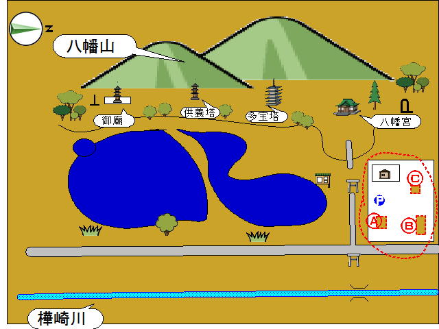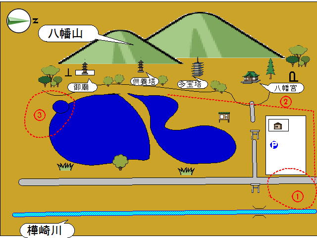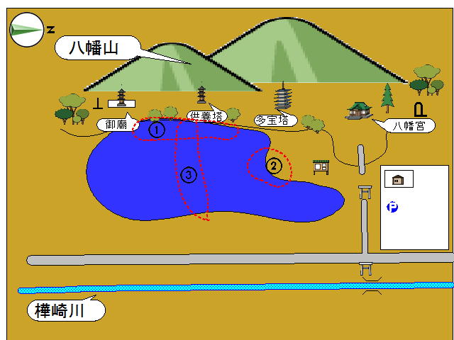 「園池跡(上から見た図)」『樺崎八幡宮』には、でっけ~池がある。 最初はな、湖け~? って思ったほど、でっけ~んだど。 これは八幡山の東側、『足利氏御廟跡』の下の平地に広がる池でな。 東西約70メートル以上 南北約150メートル あんだって。 実は、『樺崎八幡宮』さ、車で行ったんだけんどな。 場所がよくわかんなかったんだ。 神社は山ん中で、姿さめ~ないし。 近くには看板、なかったし。 ほんとにこっちだべか~? って、心細くなったところに現れたんが、 この、巨大な池だったんだ。 おかげで『樺崎八幡宮』さ、通り過ぎずにすんだんだっぺ。 やっぱし、初めての場所ってのは、緊張すんだべな~。 だから、余計に周りさ見えなくなっちまってな。 池を発見した時の、感動! と、ほっとした安心感! すんごく、うれしかった~。 これは、八幡山からみた、池。 ちょうど『多宝塔跡』辺りから、撮った写真だな。 この辺りは、池の北っ側でな。『鶴池』って呼ばれてとこ。 奥のほうに、石の橋が見えんね。 あの辺りが『樺崎八幡宮』へ入ってくる参道さ、あっとこだど。 んで。その先にある『樺崎川』から、 水を引き込む入り口に、なってんだ。 これは『足利氏御廟跡』近くで、撮った写真。 木々の間から見える水面が、池の南側でな。『亀池』って呼ばれてる部分なんだ。 ほんとはな。全体の写真さ、撮りたかったんだけんど。 木がじゃまでな。無理だった。 写真さ無理でも、肉眼で・・・って、 崖ぎりぎりまで近寄ったら。 あ、足下危険!崩れてる! ってことで、上から全体を見渡すことは、無理でした。 昔は、木もなくて。 崖も崩れて無かったから。 崖の上から、池全体が見渡せたんだろうな~。 いいな~。うらやまし~ど!《参考》日本の遺跡 41樺崎寺跡 足利一門を祀る下野の中世寺院/大澤伸啓【RCP1209mara】価格:1,890円(税込、送料別)最後まで読んでもらって、うれしい~ど~♪ あんがと~。 ランキング参加中! ぽちっと 押しとこれ~!にほんブログ村にほんブログ村にほんブログ村