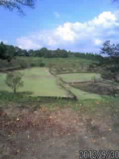 「千人溜まり」 昨日のブログさ載せた広場は、『千人溜まり』って名前さついてる、曲輪なんだ。 人が千人、入れるぐらい、でっかいからついた名前なんだと。 兵士の訓練や、馬の調教に使われたって話だべ。 これは、『千人溜まり』の南西方向から、撮った写真だど。 南西には『本丸跡』の高台さ、あってな。 上から曲輪全体が、見わたせんだ。 手前の土んとこが、『本丸跡』の崖だど。 しかし、広いな~。 ここだけ見ら、絶対、山城だって、わかんないべ。 どっかの公園の、芝生広場みたいだどw。 曲輪の大きさは、最大部分で 東西・約440メートル。 南北・約420メートルぐらい、あんだって。 ここの曲輪は、三つに分かれててな。 50センチぐらいかな? 低めの段差で、区切られてんだ。 区切り目んとこに、低い木が植えてあってな。 散策すっときは、邪魔っ気だな~。 って、思ったんだけど。 写真で見っと、曲輪の区切り目がはっきりみえて、わかりやすいな。 曲輪の中で、目立ったのは、これ。『溜池』の跡だど。 今は、水さなかったけんど。 昔はここに、水さはってあってな。 貯水池の役目も、してたらしいど。 これは、『溜池』の西から北にかけて広がる、曲輪。 確か『溜池』近くから、撮った写真だから。 北っかわから、南のほうさ見て写したもんだっぺ。 広~い芝生だべ~。 歩くと、さくっ、さくっ、って音がして、 も~、最高の踏みごごち~♪ イナゴもいたどw。 遠くに見える土壁は、『本丸跡』の切岸だど。 あとで詳しく、書く予定だけんど。 4~5メートルぐらいの、高さだったかな。 いい眺めだど~♪ も~、これだけで、満足、満足~♪ あと、やたらと多かったのが、これ。『ゴルフ禁止』の立て看板だべな。 気持ちは、わかんど。 素敵な芝生に、ゴルフの練習には、ちょうどよさげな、なだらかな斜面。 広さも、グラブを振り回すだけの空間が、め~いっぱい、あんだかんな。 だ・ど・も。 ここは城跡! 芝目じゃ~なぐって、縄張りさ、見んべ~! これは、『溜池』の北側。 池よりは、やや広い大きさの曲輪んとこの写真だど。 周りはぐるっと、低めの土壁で囲まれてんだ。 土壁の上は、細長い曲輪になっててな。 さっきの、曲輪の写真だと、上に写ってる曲輪につながってんだ。 地図だとな。ここに『千人溜まり』って、記載されてんだけど。 歩いてみた感じでは、千人、無理だべな。 ぎゅ~っと詰めても・・・300人・・・かな~。 あとの700人は、どうすべな~? ってことで『千人溜まり』って~のは、ここじゃ~なくって。 ここ辺の曲輪、全部ひっくるめた呼び名じゃ~ないかな? って、思ったんだけど。 どうだべな? そんだったら、千人、余裕ではいれんど。 案内板とは、違っちゃうけどなw。 《参考》【送料無料】関東の名城を歩く(北関東編(茨城・栃木・群馬))価格:2,310円(税込、送料別) 最後まで読んでもらって、うれしい~ど~♪ あんがと~。 ランキング参加中! ぽちっと 押しとこれ~!にほんブログ村にほんブログ村にほんブログ村