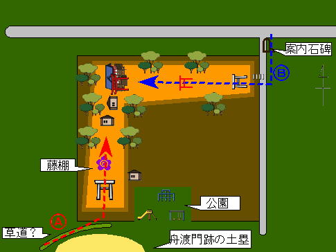 「頼政神社 4」『頼政神社』の地図さ描いて見た。 だいたい、こんな雰囲気かな? ほんとは境内に小さな神社が、いくつかあったんだけど。 境内社さ全部書き込んじゃうと、 わがんなくなっちゃいそうなんで、やめといた。 たしか、『お稲荷さま』と『八幡宮』のお社があったど。 あ、『八幡宮』は、頼政の守護神なんだって。 ふ~ん。そんじゃ~『お稲荷さま』と『頼政さま』は、どんな関係? 神さまさ、まとめちゃっただけ? なんかな~。 ええ~と。 大きな神社は3つ。そして、土塁の下に、1つ。 額さはっきし見なかったんで、名前さわかんないんだけど。 一番大きく威厳のある、新しい神社が、『頼政神社』だべ。 他に、舟渡町から移動した『水神社』と、 石町から移した『大鳥神社』があんだと。 どれがどれかは、わかりません。 誰か知ってるけ? 神社さ入る参道は2つ。 赤いAの参道は、『舟渡門跡の土塁』の横さ割り込んできた道。 今回、たどってきた道だど。 そして、青いBの参道が、一般的な道かな。 通りから、ちょっと入り込む形でわかりづらいんだけど。 こっちにゃちゃんと、入口さ示す石碑さあっから、 まちがえないべ。 で、青いBの参道は、Aの参道よりも倍長い。 けんど、最初の登り石段がきついだけで、 その後は、緩やかな参道だったっぺ。 Aの参道なら、足腰痛い人でも、歩いてこれるど。 Bの参道は、急坂で滑るから、足腰が弱い人は要注意だど。 今考えると。 Aの参道も、Bの参道も、『観音寺曲輪』さ登る道だったんよな~。 とくにBの参道は・・・土塁さ登ってる~、て実感できる山道。 土塁登りさ好きな人は、絶対Bの参道さ、登ってみとこれね。 たのしいどw。 参道の脇は、緑さいっぱいでな。 町ん中とは思えない。ここだけ山さ、持ってきたみたいなとだったど。 自然さいっぱいで、葉っぱもいきいき、つやつや。 空気もきれいでいかったな~。 でも、緑がわさわさしてたんで、 土塁の斜面は、確認できねがった。 残念。 いんや。見えなくって、よがったかな。 両脇が深い急斜面だったら・・・ 怖くて、神社さじっくり参拝できなかったもいんないど。 横は民家さ、ぴったりくっついてたしな~。 今回は時間さねがったんで、土塁の上しか見なかったんだけど。 ぐるっとまわったら、 土塁の斜面さ鑑賞すっとこ、あったかも、な。 そだ。『頼政神社』は、古墳の上にあるって、聞いてたんだけんど。 あれは、『今の頼政神社』じゃねぐって、『昔の頼政神社』のあったとこの、話なんだと。『頼政曲輪』にあったんだな、古墳。 水に沈む前に、発掘調査さしてな。 小さいけんど、石廊と副葬品がいくつか発掘されてんだ。 名前は付いてないみたいだけんど、ちゃんとあったんだな。 ってことは。 古墳時代のころから、『古河城』周辺は、人さ住んでたってことだべな。 へ~。 この辺は、そったら昔から、人が集まる場所だったんだな。 やっぱし、広大な川があったせいだべな。 っと。あれ? 今日は『狛犬さま』の話さ書こうと思ってたのに、 参道の話になっちゃった。 このままいくと、なんの話か、わがんなくなりそうだなw。 なんだか長くなっちまったんで、今日はここまで。 とめどない雑談さ付き合ってくれて、あんがとね~。《参考》 『古河城 水底に沈んだ名城』 古河歴史博物館(博物館の特別展示の図録目録) 最後まで読んでもらって、うれしい~ど~♪ あんがと~。にほんブログ村