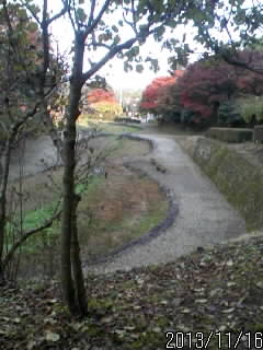 「佐久山城広場の奥」『佐久山城』は『つの字』さ、ひっくりけ~したような形さしてる。 だもんで、真ん中んとこに、広い低地の広場があんだ。 今は『瓢箪型の池』になってる。 他に池が三つぐらい、あったべか。 季節によっちゃ、アヤメやスイレンの花が咲くみて~だど。 今は花も休眠中でな。水も涸れちまってるけんど。 夏頃になったら、また違う表情さみせんだべな。 広場の突き当りにゃ、岩さ組んであった。 たぶん、滝だべなw。 ほんと、日本人って、滝好きだなぁw。 滝の上が『バラ園とボタン園のある曲輪』 写真じゃわかりにくいけんど。 中間あたりに細い道と段差がめ~る。 『謎の石垣』さあった道だっぺ。 すげ~高さだな。 見上げただけで、くらくらしちまうど。 こっちは、『まっつぐな道』がある方向の崖。 石垣は、崖崩れ防止用かな? 公園化されたときに、こしゃったもんだべな。 刈り込まれた植え込みや石垣さあっから、昔のまんまじゃないけんど。 急斜面の崖から、 ぐいっとおさえこむような、威圧感さただよってくるど。 戦のとき、こったら場所に入り込んじまったら、 山の迫力に押されて、戦意喪失しちまうんじゃね~け。 山の情景を、うんまい具合に利用してんなぁ。 そったら崖の一部に、東屋が建ててあった。 休憩用にゃ、ちょうどいい。 だけど、なんであったら高いとこさこしゃったんだ? 軽く見積もっても、2メートル以上はある崖の上に、 東屋だけが、ぽつんと建ってんだ。 階段さ登っていくだけで、体力消耗しちまうど。 休憩さ、なんね~んじゃね? 登ってみると、綺麗な四角形の土地。 東屋用に、均したんだべか。 それとも・・・なんか建物さ、あったかな? こっからだと、広場全体が見渡せるんだよなぁ。 もし、ここに矢倉さあったら、 上からじゃめ~ない部分を、補強できんじゃね~かな。 今は公園入口さなってる東側も、よくめ~るし。 広場さ侵入した敵を全部、見通せるど。 この辺はあちこち、いじられちまってるかんな。 お城の跡じゃないんかな。 ど~だべな? 階段さ降りて。公園入口方向へ。 ほてほて歩いていくと、 綺麗に色づいたモミジ。 振り返ると、『本丸』周辺のモミジも、 真っ赤だな。 毎年、11月のはじめごろになっと、こったら綺麗に紅葉さするらしい。『秋の佐久山城』さ見るにゃ、一番いい時期だったな。 今度は夏。『ひょうたん池』にアヤメやスイレンさ咲くころ、来てみたいな。 きっと『夏の佐久山城』も、素敵な顔さみしてくれんだべな。 ってことで。『秋の佐久山城』散歩の備忘録は、ここまで。 いや~。また行きたくなっちまう城跡だったな。 満足度も上位に入る、良い城跡だど。 ぜひ、いってみとこれね~。:*:*:*:*:*:*:*:*:*:*:*:*:*:*:*:*:*:*:*: 最後まで読んでもらって、うれしい~ど~♪ あんがと~。 ランキング参加中! ぽちっと 押しとこれ~!にほんブログ村にほんブログ村:*:*:*:*:*:*:*:*:*:*:*:*:*:*:*:*:*:*:*: