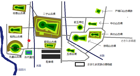 「古墳群の北エリア」 とうとう、『さきたま古墳群』の北側さ来た。 どの辺かわかりやすいように、地図さ描いてみたど。 らくがき地図なんで、細かいとこはちがうけど。 こんな感じで、古墳が広がってるとこなんだ、って わかってもらえると、いいな。 で、今回は、赤い星印の辺りのお話。 東南のほうへ、まっつぐ伸びる道。 綺麗な道だね。メイン道路かな? だども、 先が、め~ないど~。 古墳も、め~ないど~。 この先に『将軍山古墳』があるって、 パンフレットにゃ載ってるけんど。 ほんとにあんの?『将軍山古墳』にゃ、展示室があってな。 石室を再現した展示がしてあるって聞いたから、 見逃したくないんだけんど。 なんか、心配になってきたなぁ。 もしかして、知らないうちに、公園内から出ちゃったんかな? と、どきどきしながら進んでいくと あ、道の左側。 木の隙間から、なんか山みたいのが、め~る。 遠いし木が邪魔で、形がわからなかったんだけど。 たぶん古墳の一部だね。 さらに進むと 今度は間違いなく、古墳! これが有名な『丸墓山古墳』だな! って、どきっとしたんだけんど、 ほんとは『稲荷山古墳』でした。『丸墓山古墳』は、円墳。『稲荷山古墳』は、前方後円墳。 ぜんぜん形さ、ちがうんだけど。 この写真の位置からじゃ、円墳みたいにめ~るよね。 実物みんの、はじめてだし。 間違っちゃっても、しゃ~ないよね~。 それにしても、でっかい古墳だな~。 こんなの初めてみたよ。 それになんか、南側にあった『奥の山古墳』や『鉄砲山古墳』と、雰囲気違うような・・・ こっちさ、先に、みようかな~。 立ち止まって、古墳さ見つめる。 や~。うずうずしてくんね~。 いやいや、やっぱし。『将軍山古墳』が先だど。 さっき、決めたんべ? 自分に言い聞かせて、先さ進む。 と、こんな案内板が、道の右側にでてきた。 おお。今度はどんな古墳かな? ええ~と・・・これ、古墳? 山だんべ~? だども、道の右側は開けた広場になっててな。 他に古墳みたいな土山は、見当たんない。 だども、これ、どう見ても、2つの真ん丸な山にしかめ~ないよ。 これは・・・調査してみなきゃ、なんないな。 ということで、目的地変更。『二子山古墳』に向かって、進むことにした。 こんなん目にして、素通りなんて、出来ないよ。 迫力といい、存在感といい。 ただの山だったとしても、近寄ってみたくなる。 なんか、おいでおいでと、引っ張られてるような? 変な感じだな。 きっと、みんなも『二子山古墳』さ目にしたら、 素通り出来なくなるど! さてさて。 どんな古墳かな? 楽しみだな~。《参考》 埼玉県立 さきたま史跡の博物館 見学のしおり ガイドブック さきたま (将軍山古墳展示館で購入)******************************************************** 最後まで読んでもらって、うれしい~ど~♪ あんがと~。 ランキング参加中! ぽちっと 押しとこれ~!にほんブログ村 *********************************************************