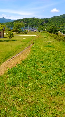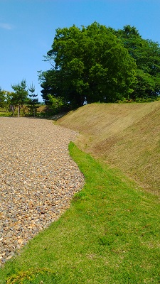 「土塁の上から」『涼台』から北に向かって、土塁の上さ歩いてく。 このへんは、『本丸の東側』になんだべな。 芝がきれいだね~。 お、あれはなんだ!? 右手の方向。『土塁の外側』に、『いっかい水堀』があるど! うわ~。すげ~。 南のほうにあった『水堀』も、川みたいに広かったけど。『東側の堀』もまた、いっかいな~。 橋が架かってるど。 向こう側に、いけんだね。 ちょっと離れて、撮ってみた。 う~む。全体は入りきれないな。 だども、後ろのお山が、きれいだね~。『いっかい水堀』と、『曲輪』。 そして、お山。 ここは、絶景ポイントだねw いいとこめっけたな♪ 場所さ変えて、撮影。『曲輪の先端』を、とらえたど。 四角に角ばった先端を、『水掘』がぐるっと、囲んでんだね。『曲輪』の向こっかわも、『水掘』になってんのかな? こっからじゃ~、め~ないな~。 よし。決めた。 次は、あの『曲輪』さ、散策すんべ。 そうと決まったら、降りるとこ、めっけなくっちゃ。 橋を渡るには、土塁の下さいかないと、 だめみたいだかんな。 さてさて。 階段、どこかな?《栃木弁:注》 いっかい = でっかい。大きい。################################# 最後まで読んでもらって、うれしい~ど~♪ あんがと~。 ランキング参加中! ぽちっと 押しとこれ~! にほんブログ村##################################