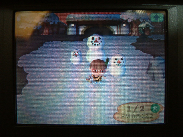 久々に12月31日からどうぶつの森をプレイしてるが以前も起こった恐ろしい現象が・・・数分後これは裏技というより不具合っぽいなあ。オブジェクト数の関係かはたまた雪だるまどうしで干渉しあうのか・・・でも雪だるまは初めて作ったときは感動したなあ。ちょっと怪しげな雪球をで遊んでるうちにうまく動かせるようになり、もしやと思って雪球同士を近づけると雪だるまになっていきなりしゃべりだしたし。しかし、このゲームはゲームというよりは仮想の人生体験かも