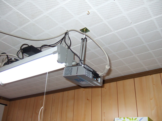 諸所の事情で加賀コンポーネントのプロジェクターKG-PL105Sを加賀コンポーネントより借りている。本体のサイズは葉書大で明るさは僅かに140ルーメン。画素は800x600のデータプロジェクターである。ちなみにプロジェクターにはプレゼン用のデータプロジェクターと映画などを鑑賞するホームプロジェクターの2種類がありデータプロジェクターはそれなりに明るくても使える2000ルーメンから10000ルーメン(真昼の明るいところでもOK)ホームプロジェクターは暗いところでみるので1000ルーメン前後。とりあえずそれなりに明るいところで映画を見るために使ってみる。(機能的に全く逆ですな)普通140ルーメンといえば暗くて見えたもんじゃなくやはり2000は欲しいとプロジェクターを使ったことのある人ほど言ってしまうのであるが驚くべきことに140ルーメンとは思えない明るさ。(体感的に10倍以上)メモが取れる程度の暗さで十分に使えるし、また、映画やゲームなど動作の激しいものでも液晶テレビなどと違ってブラウン管のように全くブレや残像がない。またLEDなのでDLP特有のレインボーノイズも無く、発熱量が少ない為に音も静か、更にはプロジェクターは交換ランプ代が高価であるが事実上ランプ交換の必要がない高寿命。利点1000ルーメンに匹敵するかのような明るさLEDによる高寿命、省電力色合いなどが非常に美しいコンパクト惜しい点ズームなどが行えない巨大アダプタ解像度今回の状況はコンパクトなプロジェクターであるが本格的な天井吊り。専門的なものは高価なので、ホームセンターで買ってきた総計500円前後のものと980円のミニ三脚で作成。赤やら青やら暗いシーンやら電気をつけた状態など