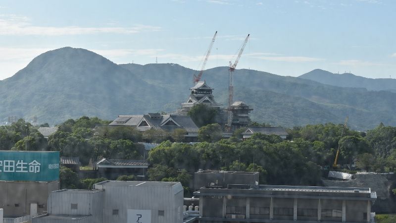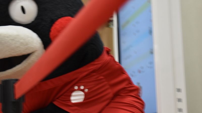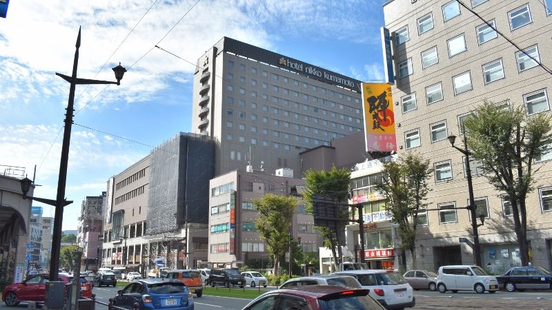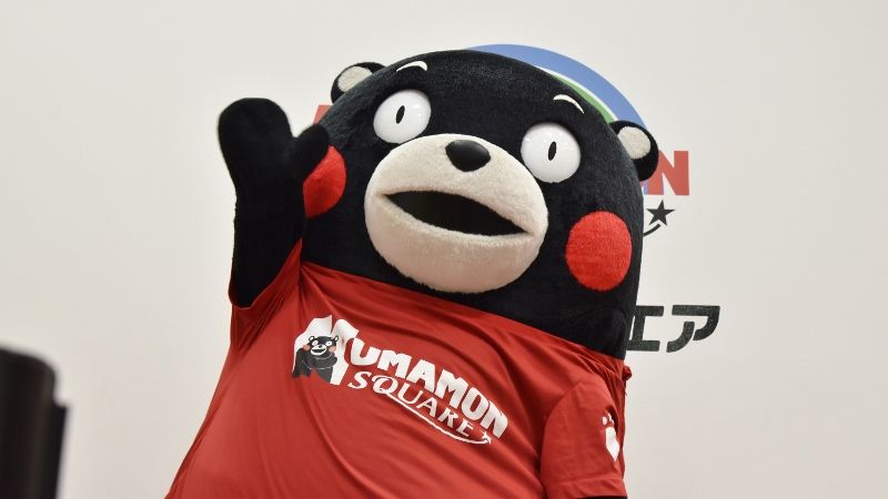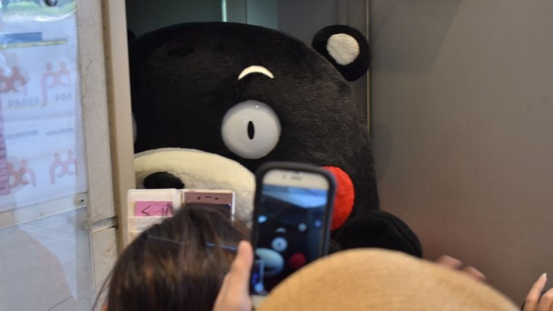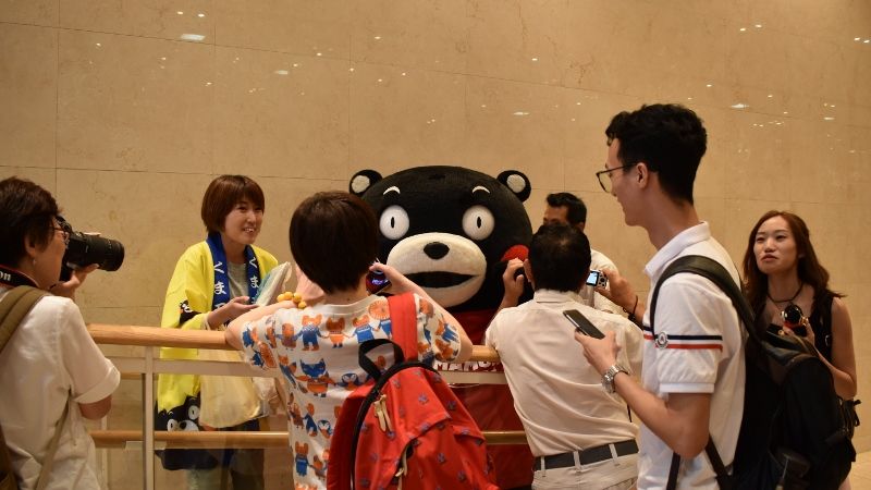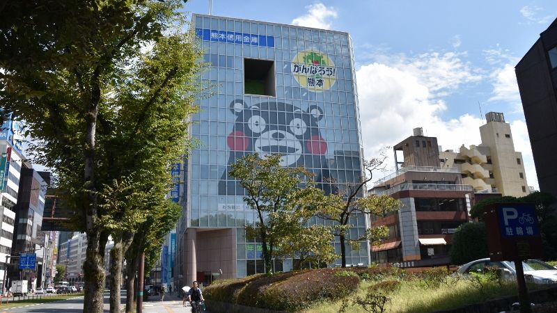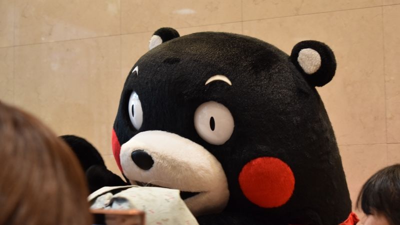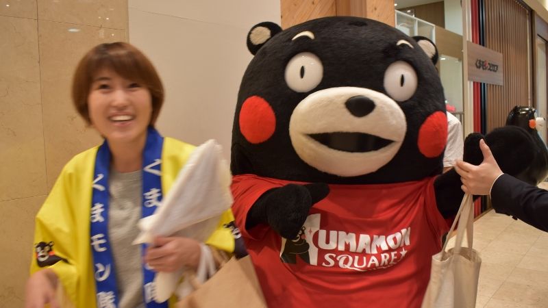 途中、ビルの壁一面にでっかいくまモンの絵が