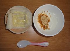 今日は、まるちゃん6時に起床早く起きたね~^^まるちゃんこの間まで便秘をしていました。硬くてコロコロしてて、切れて血が出たり泣いたりしてかわいそうでしたおしりにポツっとできものも出てきて(便秘をするとでてくるみたいです)毎日ヨーグルトも食べてるし、なんでだろ~もしかして、粉ミルク変えたからかな???と思って、今まで使っていた粉ミルクに変えてみると便秘が治りました!早くおしりのできものが治るといいなぁ~。☆朝食☆・クルクルチーズ巻き・きな粉ヨーグルト