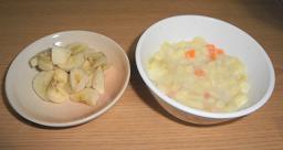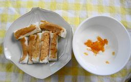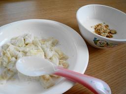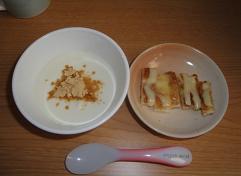 私は、おばかさんの事ばっかりする。。。昨日は、写真屋さんにデジカメをプリントしに行ったのだが、メモリースティックの入れる所を間違えてメモリースティックが出てこなくなってしまった・・・。入れてる間なんかおかしいなぁ~とは思ったんだけど、入れてしまいました。な~んでおかしいと思っているのに入れちゃったんだろう・・・ていうか、明らかに入れるところが違うのに店員さんがなんとか頑張って出してくれたので良かったです。店員さんごめんなさいm(_ _;)m今年にはいってからは、お皿を3枚も割っている。自分ではちゃんと持っているつもりなんだけど、おかしいなぁ。今年は厄年だからかな・・・( ̄∇ ̄;) ハッハッハッ☆朝食☆・チーズトースト・きな粉ヨーグルト今まで手に食べ物を持って口に入れる事をしなかったまるちゃんだが、今日はチーズトーストを口に持っていって食べる事ができた!!出来るようになってよかったね今まで出来なかった事ができるようになるってうれしいですね!☆昼食☆・ミックスベジタブルとシーチキンのおかゆ・バナナ
