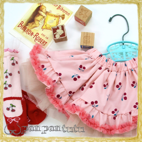 panpantutu/パンパンチュチュベビー服 フェアリースカート/チェリー柄ピンクベージュ(0~2歳・Sサイズpanpantutuパンパンチュチュ ベビー服 チュールリボントップ(半袖)*ブラック 出産祝いベビーギフトベビーピンク右のモデル着用のフリフリキュロット ライトデニムフリフリボトム チェリー柄 Fサイズ 1歳から3歳まで幅広く着用できます