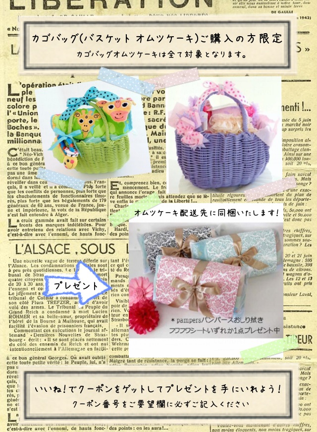 いいね!クーポン配信開始!バスケットオムツケーキ(カゴバッグオムツケーキ)をご購入の方対象いいね!をしてクーポン番号を取得してくださいクーポン番号取得&ご要望欄にご記入のお客様に・・・もれなくパンパースおしりふきプレゼント!当店オリジナルのダマスク柄ラッピングで、おむつケーキと同梱でお送りします。お見逃しなく!