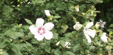 ムクゲはインド・中国原産の落葉樹なのだそうです。この暑さの中、涼やかに咲き、何か爽やかさを感じさせてくれます。北関東や岐阜では気温が40℃を超えたとか。私が住む東京都多摩地区でも、早朝から30℃超えです。朝、出勤のために外へ出た時の不快感。 会社へ行くのがイヤになります。その暑さも、今日あたりまでらしいので、もう少しの辛抱ですね。 さて、ムクゲに話をもどします。植物の育ちにくい土地でもよく育ち、乾燥にも強い花らしく、自宅のまわりでも元気に咲いています。ひとつの花は1日しか咲かないらしいのですが、次々と綺麗な花が咲き、私たちを楽しませています。花期は、まさに今。 初夏から秋にかけてだそうです。ムクゲは淡い紫色の花が多いようですが、写真のような白いムクゲもなかなかのものです。あーーー!この綺麗なムクゲを朝の澄んだ涼しい空気の中で観賞したい!明日の朝はどうかな? ★やり直し英語にご興味がある方へ 英語学習カフェ ~無料英会話教材の紹介など ~姉妹サイト 「気楽」に「楽しく」英語に取り組むための情報がいっぱいです。