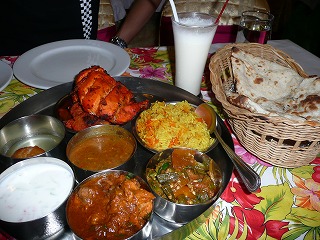 食べるばかりでごめんなさい。 バンコクにはたくさんインド料理店があります。私は日本にいるときからナンが大好きで、日本にいるときもインドカレーのお店には何度も行きました。バンコクへ来てからはたくさんお店があるのに、行ったのは2回。そのうち1回は直実さんと行ったランマハールとブログには書いていませんがバンコクへ来てそんなに日が経っていない時に行ったスクムヴィットsoi26の「インダス」。今回サーミーと行ったのは、スクムヴィットsoi3にある「Akbar」というお店。スクムヴィットsoi3と言うのはBTSのナナ駅近くの通りで、このあたりはアラブ人やインド人が多い街です。なので、本格的インド料理やアラブ料理がたくさん並んでいます。「Akbar」は、歩くバンコクにも載っていて豆のカレー「ダル」が有名だそうです。今回、それを食べようと思ったのですが、マネージャーらしき人が「このセットをシェアしたら?」というのでその通りにしてみました。タンドリーチキンとその下にケバブが隠れています。そしてサフランライス、オクラのカレーにマトンカレー、そしてダル。白いものはヨーグルトとキュウリが入ったもの、その隣は甘い甘いインドのスイーツで、揚げダンゴのシロップ漬けこれで350Bです。結構量が多くて、ナンはもう1枚追加しましたが、十分でした。タンドリーチキンとケバブは結構しょっぱかったのであまり食べませんでした。カレー3種の中ではオクラカレーが私は好きです。マトンは、かなり煮込んであってお肉が骨からホロっと外れました。このお店で有名な「ダル」が一番辛くて食べにくかったです。でもこれが本場のダルなのかもしれません。豆カレーって甘くて食べやすいイメージを持っていただけに驚きましたが、あとを引くカレーでした。このセット、これにコーヒーが1杯付きます。なので私もコーヒーをお願いしましたが、トータル550B。お水代は取られません。なんと良心的なお店でしょう!やはり場所柄なのかもしれません。日本人が多く住む場所はどうしても値段設定が高くなるようですがこちらはそうではありませんでした。このお店、私たちが入ったときは1組の観光客(日本人ではありません)がいただけなのですが、その後続々とお客様が入ってきました。観光客らしきカップルや、在住のインド人、常連さんと思われる方々など・・・。やっぱりここは本場のインド料理を食べさせてくれるお店なんだなとよくわかりました。 そうそう、お口直しは氷砂糖になにやら入ったものでした。「口の中がスッキリする」と言っていたのですが、何が入っているのか聞きそびれてしまいました。氷砂糖とこの細いもので口の中がスッキリするとは思えなかったので、私たちは食べませんでしたが、観光客の方々は食べていたようでした。ナナ駅周辺には行ってみたいお店が数多くあったのに、結局ほとんどのお店に行くことが出来ませんでした。残念ですが、またの機会に取っておこうと思います。