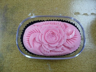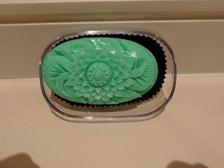 カービング10回目からは石鹸に入ります。普通の石鹸がほら、こんな感じ!フルーツや野菜と違って削る加減がわからなくて、花びらも取れちゃいそうでした。こう見ると結構いけてる?でも、よくよく見ると、酷い有様です。花びらの大きさ、全部違います葉っぱのVカット、散々です先生の手直しがなければとんでもないことになっています。でも、石鹸カービング、楽しいです。残すこともできるし♪ 始める前は、野菜やフルーツのカービングがしたかったのだけど、石鹸を始めたらこっちの方が楽しいかも?あと5回、頑張ろうっと!