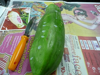 7回目のカービングはソムタムでお馴染み「青パパイヤ」でした。この青パパイヤ、皮を剥く前にナイフで穴をツンツンと空けて、汁をだします。かなりの量がでました。先生が洗いに行ったくらい・・・。皮を剥いたら頭から始めます。頭はバラになります。先生に手伝ってもらった片方。言い訳だけど忙しすぎて、遅刻して半分しかできなかったので、持ち帰ってフライトの準備をして夜10時から始めた片側(すごい言い訳・・・)。マイ・スワイナカー(キレイじゃない)(>_<)酷い出来でしたが、1人で頑張ったことがよかったかな~と思うことにします。この日作ったものは、上が少し空いているので、こうやって使ったりします。 カービング8回目も公開。スイカちゃんです\(^o^)/食べるの大好きスイカですが、カービングとなると厳しいです。だって、種は今回少なかったけど、熟れ熟れで果汁が・・・。削っていると果汁で見えなくなります(>_<)とても難しくて、これまたマイスワーイでした(T_T)花びらがね、どうもできません。最後の方になって先生に言われたことがやっと分かった私・・・。遅すぎです。葉っぱは、スイカの皮で作りますが、皮が硬いので意外と大変でした。頑張ってもあと5回かなあ・・・。5回で1区切りなので10回は厳しいかも。楽しいんだけどね。