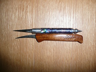 ソープカービング2回目3回目の作品です。この回からナイフが変わりました。 木のナイフが古典ナイフだそうです。上の方がこの日から使うナイフ。いろんなカラーがあって選ぶのに迷いました。お友達は、古典ナイフに比べて新しい方が使いやすいと言いましたが、新しいナイフは形が似ているので、どっちが切れるのかわからなくなりました。何度か間違えて石鹸に穴を掘ってしまったので、先生に言うと切れない方に青いマジックで印をつけてくれました。2回目はバラ。バラはホントに苦手です。言い訳ですが、ナイフが使いにくくて・・・あまりの酷さに先生が直す直す(>_<)先生ってばどうして、こんなぐちゃぐちゃな作品をこんなにキレイにできるのかしら?実は花びらが一枚取れてしまったのですが、先生はお水に取れた花びらをちょっとつけてから元の場所に戻しました\(◎o◎)/凄いです、ホントに。3回目はハート。ハートの部分、先生がさらさらっと「ナミナミ」に半分削って私に渡すので思わず「先生今なにやったの?」と聞いてしまいました(^_^;)両隣の方から失笑されてしまう私思ったのは、やっぱり落ち着かないでやってもダメだなあということ。今日も時間ピッタリもしくは早めに終わらせないと次の予定に間に合わなくて、焦りました。焦ってもいい作品ができるわけないし、通常のコースは週に1回。その間に復習したり練習したりします。それがないまま次々進んでも上手くはならないと思いました。あと3回、落ち着いて作りたいと思います。
