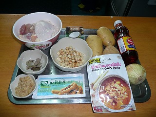 この日は「ゲーン・マッサマン・ヌア(タイ・南部のカレー)」・「ヤム・コームーヤーン(豚の首肉のサラダ)」・「トートマンクン(エビのすり身揚げ)」・「ルーク・チュプ」の4品。 ゲーン・マッサマンは材料がジャガイモやたまねぎなどを使うので日本のカレーみたいですが、ピーナッツを入れたりココナッツミルク・タマリンドを使うのでやっぱりタイのカレーです。マッサマンペーストと言うペーストがこちらでは売られていて(昨日買ったら9Bちょっと)教室でもこのペーストを使いました。レシピにはペーストの作り方が書いてありますがなかなか大変そうです。こちらが材料。手前の白い袋がマッサマンペースト。隣の袋はタマリンドペーストです。完成して小鉢に分けたものがこちら。ヤム・コームーヤーンは豚肉の首のお肉を使いますが日本では肩ロースがいいそうです。漬けダレに20分つけてロースターで焼いて、薄く切って調味料で和えると完成。30分つけて焼くと「コームーヤーン」になります。トートマンクンは嫌いだと言う人がいない(私の周りでは聞いたことがありません)くらい人気のタイ料理。エビのすり身に豚挽き肉を少し足して油で揚げて、スイートチリソースで食べます。この日は川エビでした。日本ではブラックタイガーで作ることになりますが、その時は脂身の多い豚挽き肉を入れるとよいそうです。以前先生が日本に帰って冷凍ブラックタイガーで作ったそうですが、あまりおいしくなかったそうです。やっぱりエビ天国のタイで作るのがいいんだろうなあと思いました。ルークチュップはお菓子です。緑豆とココナッツミルクで作った餡に食紅で色をつけてリンゴや人参などいろんな形にしてからゼラチン(寒天)でコーティングしたお菓子です。バナナやイチゴ、さくらんぼ、マンゴー、パイナップルなど短い時間の中で頑張って作りました。私はタイに来て間もなく、このお菓子を食べたのですが、ものすごくまずかった覚えがあります。劇甘で、もう二度と食べたくないと思っていました。でも、タイ料理教室で作ったものはおいしくて、コーヒーと一緒に食べると止まらなくなりました。もっといろんなお料理を勉強したかったのに、この日が最後なんてとても寂しかったです。先生からは修了証書とタイのお玉をいただきました。タイに遊びに来るときはタイ料理教室のある日を狙ってこようかな?とひそかに考えています。短い間でしたが、先生、みんな本当にありがとうございましたm(__)m