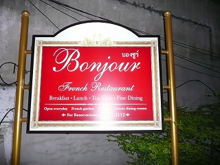 うちの近くに新しいレストランがオープンしてました。名前は「Bonjour」名前で想像がつきますがフレンチレストランです。こちら、2月にOpenしたのですが、この看板の反対側にある看板にライトアップされたのは1月。やってるのかな?と思ってお店をのぞいたらまだまだ工事中だったというお店です。お友達なんて看板の前から電話したら「まだです」と言われたと(-_-;)だったらライトアップしなきゃいいのに・・・。Openしたてで、まだ何も情報がない状況で私たち、出掛けてみました。だって時間がないんだもの~。外観はこんな感じ。夜なのでわかりにくいけど、邸宅と言う感じです。この日はサーミーが日本から帰国し、私は私で18時半頃までお出かけする用事があり夕飯を作る時間がなかったので前々からこの日に行こうと決めていました。でも、何も情報ないレストランに夜出掛けるって恐ろしいですよね(^_^;)ドリンクメニューを渡されて、そのお値段にちょっと驚きました。「この場所でこの値段?」と目を疑っちゃいました。でもまあ、もう1ヶ月のバンコク生活だしとりあえず1杯はオーダーしてみました。「お疲れ様~カンパイ!」サーミーのオーダーしたものは「ノンアルコールカクテル」に分類されていましたが、どう見ても飲んでみてもスタ〇で売られているドリンクと変わりありませんでした(-_-;)アミューズはサフランライスのリゾット(らしい)にエビがのせられているものでした。結構これはおいしいと思います。お米の歯ごたえが私好み♪ パン2人で3個って・・・。大食漢のサーミーがいるのに・・・。味は悪くないです。メニューはかなり内容が濃くて読むのに時間がかかりました。結局お店のスタッフお勧めのメニューに収まった私たち。前菜はフォアグラを2人でシェアしました。日本に帰ったら絶対食べない、いや食べられないし。ソースはナッツとイチジク。これ、メインでもいいかも・・・。それにしてもフォアグラとフルーツのソースってホントに合います。サーミーの選んだメインは和牛。それも400gもありましたかなりのボリューム。これを2人でシェアするべきだったのかもしれませんが、この日のサーミー、帰りの飛行機での機内食が劇マズだったらしくほとんど手をつけなかったそうで、おなかが減りまくり。私に一口だけくれてペロリと食べてしまいました私がオーダーしたのはブイヤベース。海の味がし過ぎました(悪い意味ではありません)。一口目はとってもおいしかったのですが、だんだん飽きてきてしまって、結局半分以上サーミーのおなかへ吸い込まれました。デザートはシェアすればよかったのに興味本位で1人1つオーダー。食べすぎです、私たち・・・。サーミーオーダーのフォンダンショコラ(という名前ではないけど、そういう感じ)黄色いものはマンゴーゼリー。手前はアイスクリーム。左のグラスはムース。こんなに出てくるなら1つオーダーでよかったなあと後悔。アイスの上にチョコチップが飾られているのですが、これが子供のときに食べたお菓子で、口の中に入れるとパチパチはじけるキャンディーのようでした。なかなか面白いです\(^o^)/私がオーダーしたのはラズベリーマカロン特大のマカロンが出てきて困りました。まあ、お味は普通かなあ。次はオーダーすることはないと思います。フレンチレストランなのでプチフールまで登場。ここでマカロンだすなら、マカロンのデザートなんて勧めないでよ!!と思いましたよ私。 こちら、看板には朝食もティータイムもありと書いているけど、今はランチとディナーのみだそうです。4月以降、朝食とティータイムは始めるらしいけど、多分やらないだろうな~。 ランチは2コースランチ480B++、3コースだと680B++なので、高いです。この場所でこの値段で大丈夫?と思いましたが、とりあえずシェフが3つ星シェフだそうです。デザートに関してはランチの方が魅力的に見えました。お試しする方はランチから行ってみましょうね。そうそう、結構お値段の張るフレンチレストランなのにドレスコードはありませんでした。さすがに短パンはどうかな?と思うけど、場所柄ここは問題ないのかも・・・。気軽に入れるけど、お値段は気軽ではありませんのでお気をつけくださいませ~。