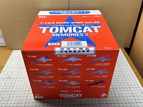 本日は エフトイズ トムキャットメモリーズ3 の発売日です。いつもは仕事帰りに某量販店で個別購入(基本4個)するのですが、今回は 欲しいな~ と思うキットが半数以上有りましたので 予約 してしまいました。個別購入すると 沼 どころか 地獄 行きになるのは目に見えておりましたので。で、意を決して BOX買い をしてしまいました。そして本日は有給消化でこの日に合わせて取得しました。朝から すしざんまいの社長 の如く腕を広げて待ち構えておりました。ま、冗談はこれくらいにして~では、お見せしよう(一文字隼人か) おお、開封口に 箱売り商品 のシールが箱の正面には今回のラインナップが有りますね。側面は赤地に トムキャットメモリーズ3 のロゴが大きく描かれております。裏面は エフトイズの社名や住所が記載されております。(写真撮ってませんけど)では、ラインナップを確認箱の下側の OPEN 部分を開けると店頭販売状態になるのですね。(開けませんけど)それでは~御開帳~ おお、箱の中に10個詰まっておりますよ~。(当たり前でんがな)では左側前列から順に一気に開封して行きますが BOX も入れたいので開封写真は小さくなってしまいます。その後再び一づつ開封してから デカール側 の写真を撮りたいと思います。(BOXを動かすのが面倒なので)写真のUPは続けてUPします。さて、何が出るのやら・・・あ、シークレットがね。では、左列1個目。1番 F-14A ジョリー・ロジャース が出ました。早速、推しが出ましたね~。因みに。普段開封後に中身が分かる様にマステを貼り付けて番号を書いております。今回は量が有るので開封の度にマステを貼ります。では、左列2個目。4番 F-14B ファイティング・チェックメイツ です。左列3個目。5番 F-14D バウンティ・ハンターズ です。左列4個目。7番 F-14D トムキャッターズ です。いよいよ左列ラストです、5個目。9番 F-14D ヴァンパイアズ です。出ましたね~箱の写真は ブラックライオンズ がメインで映っておりますが、私の今回の 一推し です。今の所 ダブリ は有りません。(当たり前でんがな)では右列に移ります。右列1個目。2番 F-14A ウルフパック です。続いて右列2個目。5番 F-14D バウンティ・ハンターズ です。右列3個目。3番 F-14B ファイティング・レネゲイズ です。そして右列4個目。8番 F-14D ブラックライオンズ です。これで9種全部揃いました。残るは1個。まだ シークレット が出ていません。ま、まさか・・・ダブリ(んな訳ね~よ)ラスト右列5個目。おお~迷彩ですよ~このシークレットは何なのでしょうかこれは S1 F-14A ウルフパック の迷彩ですね。なかなか良いではないですか。因みにシークレット2は。もう一つは S2 F-14D スパートムキャット 1990年代 と表記さてれております。初めての BOX買い でしたが、楽しませて頂きました。しかしながら・・・前回の トムキャットメモリーズ2やPLATZ の未制作のキットが有るのに・・・何だか・・・トムキャットだらけになってもうた・・・