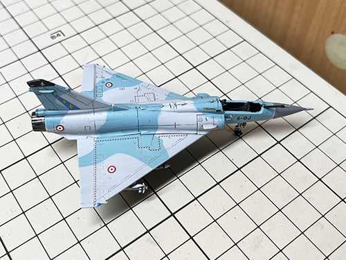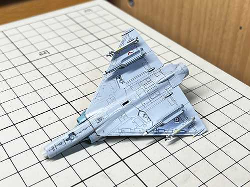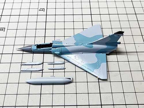 エフトイズ ミラージュ2000 フランス空軍機 制作その2 です。今回は スミ入れとデカール貼り です。いつものスミ入れ前の一吹き。塗装にマット感があったのでスミ入れの前に機体全体にクリアーを吹き付け。そしてスミ入れ。下面はこんな感じ。そして細かなパーツもスミ入れ。ミサイルは下面と同色でしたが、何となく色味が欲しくてネットで色々探したらいい感じのがあったのでパクって塗装&帯入れを行いました。そしてデカール貼りです。何とか主翼上面の 点々ラインのデカール も貼れました。下面はこんな感じ。いや~、前回の F-16 と比べてデカールが少ないので楽でした。今回は以上です。
