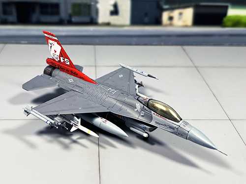 以前制作した PLATZ F-16C三沢(2機セット) の残りをアメリカ空軍 F-16A ルーク空軍基地 第21飛行隊 ギャンブラーズのデカールを購入し 21SQver で制作した機体の完成写真です。垂直尾翼の派手さがgoodですね。第21飛行隊は中華民国(台湾)軍のパイロットを育成する部隊なので、武装は 三沢基地 で使用しなかった ポッド類 を取り付けました。キャノピーの後部には部隊のマークがついてます。中のコンソール側面には台湾国旗のデカールを貼ったのですが、ほぼ見えなくなってしまいました。キャノピーの前側は エフトイズのF-16 よりも黄色みを抑えたつもりでしたが、もう少し薄くても良かったと思います。では、F-16C三沢 とツーショットを。続いて・・・今回の F-16 のキャノピーと同時に塗装し直した F-22とタイフーン の完成写真も撮影し直しましたので、それぞれの 完成写真 に追加しておきました。良かったらみてやって下さい。PLATZ F-22A 完成写真PLATZ ユーロファイター・タイフーン 完成写真