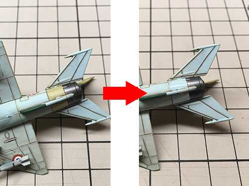 尾翼下部の色が機体上部の黄色が回り込んでいることに気づき、