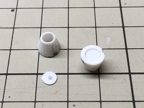 0.5mmのプラ板を丸く切り出し、それらしく放射状に溝を彫った後に中心に1mmプラ棒の先端を丸くしたものを貼り付けました。